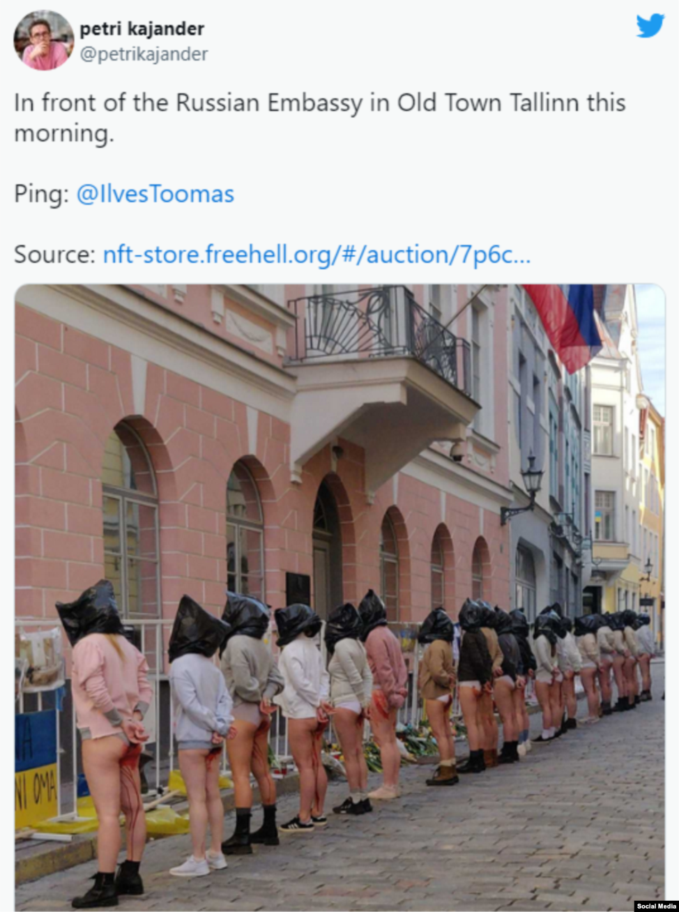 Frente a la embajada rusa en Estonia, por varios días, activistas contra la invasión rusa se reunieron para protestar por las violaciones cometidas por las tropas rusas en Ucrania. Docenas de ellas se desnudaban parcialmente, se echaban pintura roja sobre el cuerpo, en especial en el vientre y las piernas. El objetivo era denunciar ante la opinión publica el abuso a mujeres y niños por parte de los soldados rusos en Ucrania.